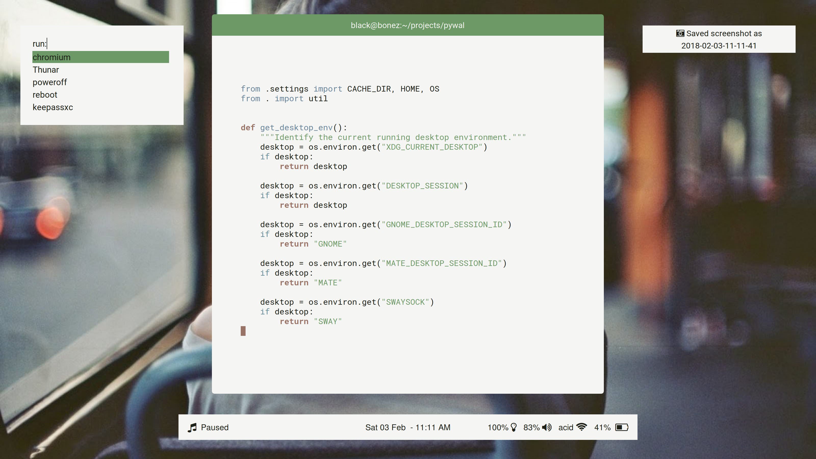 ~/.config/wal/colorschemes. wal --themecan be used with colorschemes exported injsonformat from https://terminal.sexy/.wal --theme /path/to/fileloads a scheme from a file.