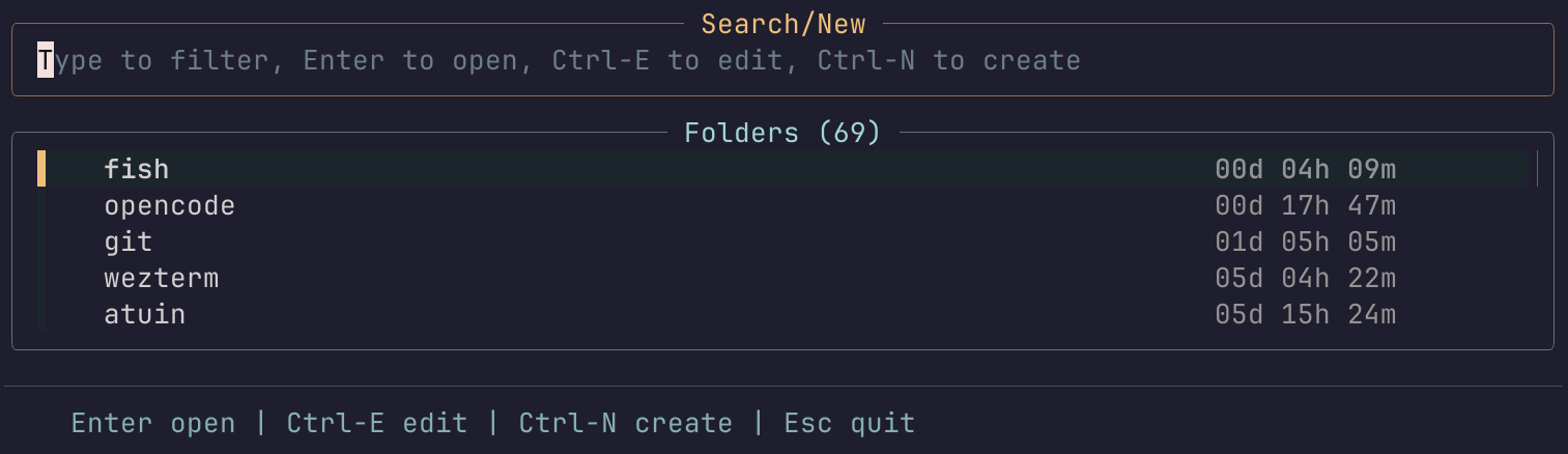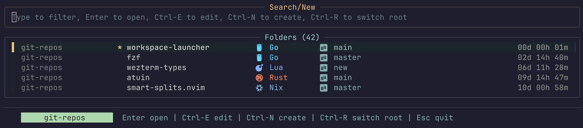 workspace-launcheris a small tool built aroundfzffor jumping between workspaces under a root directory such as~/git-repos. It sorts entries by recent activity, shows age/language/git metadata inline, and lets me create a new workspace directly from the current query withCtrl-N.Repo: lalvarezt/workspace-launcher